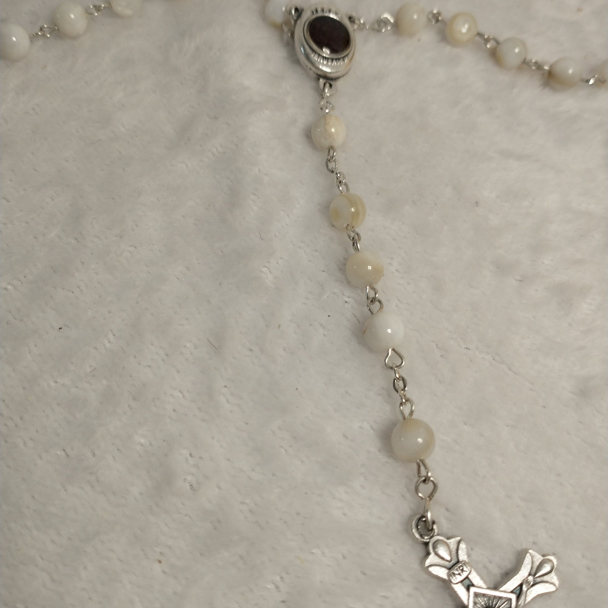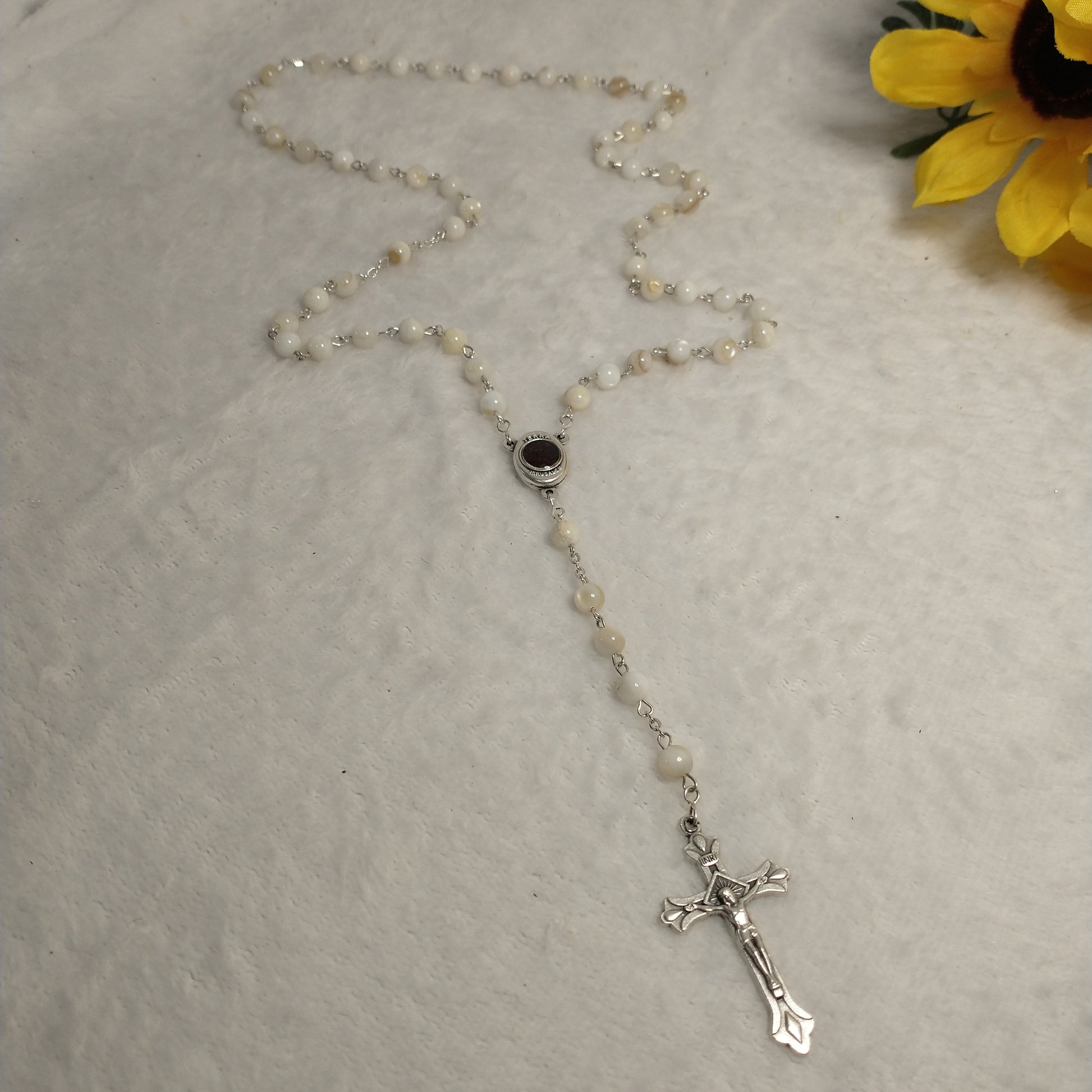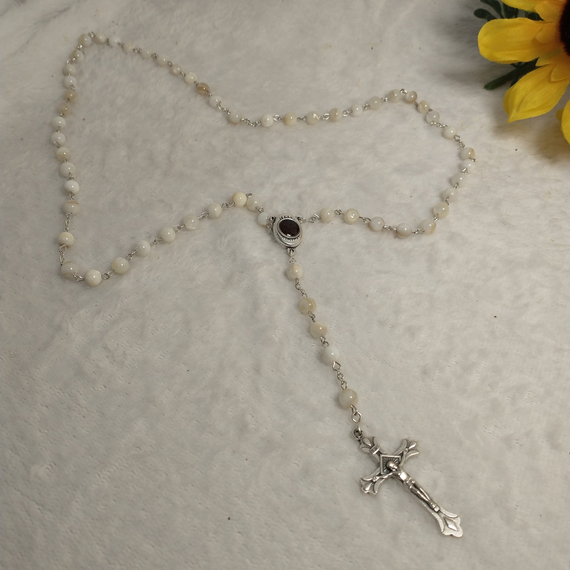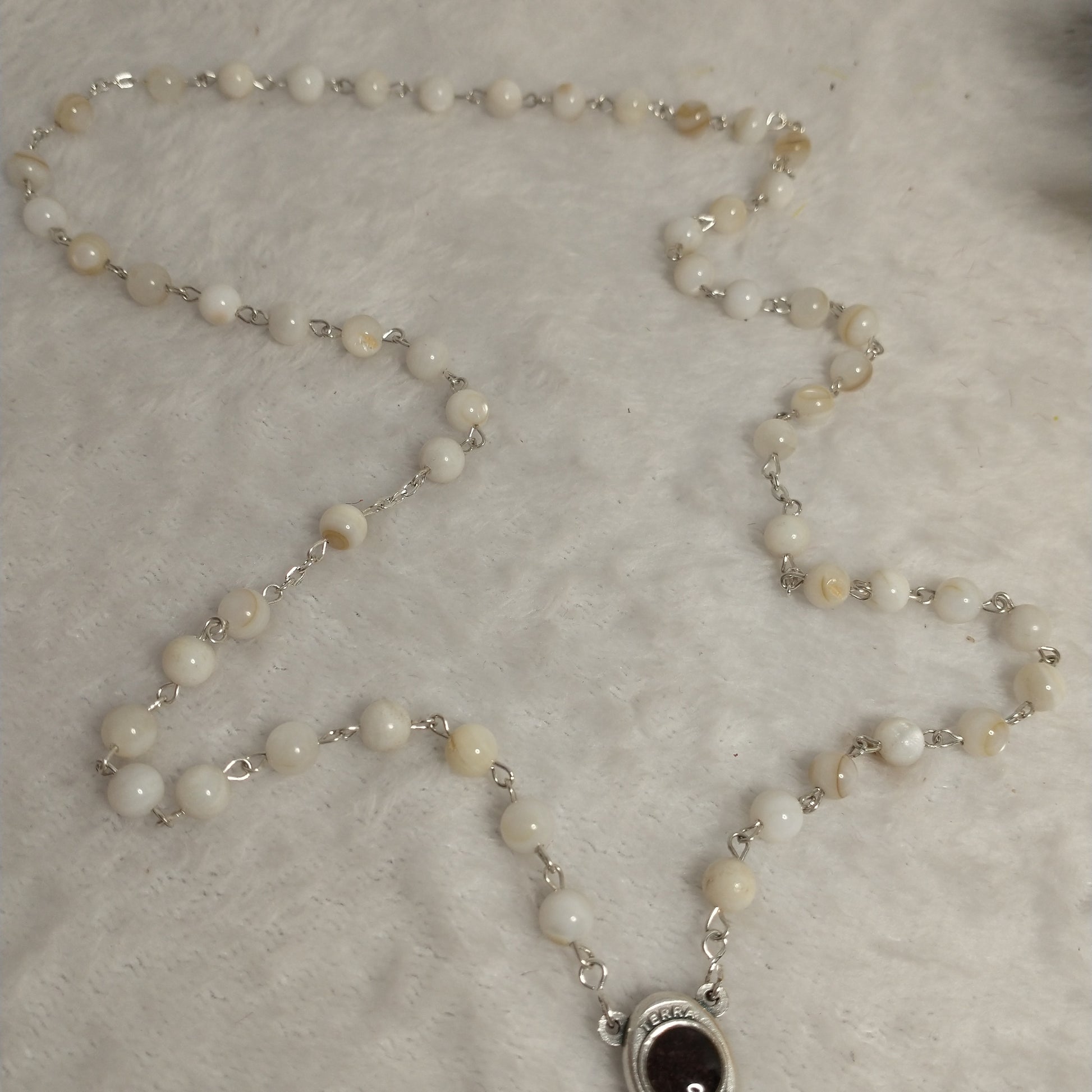 Natural white Mother of Pearl rossary with holy Soil from Jerusalem hand made .