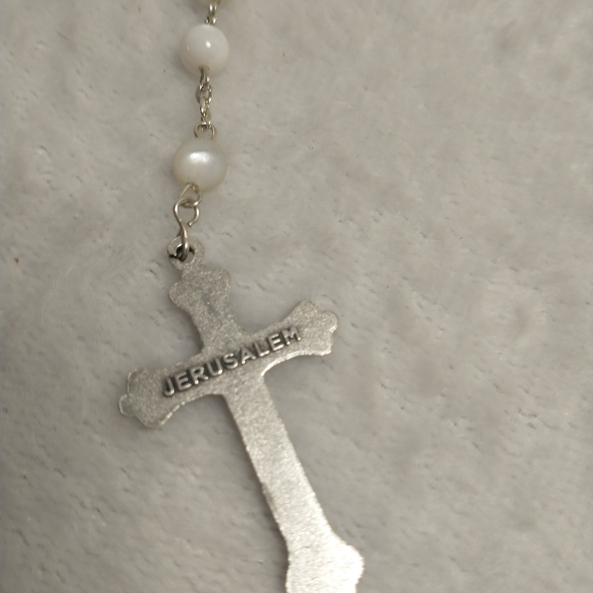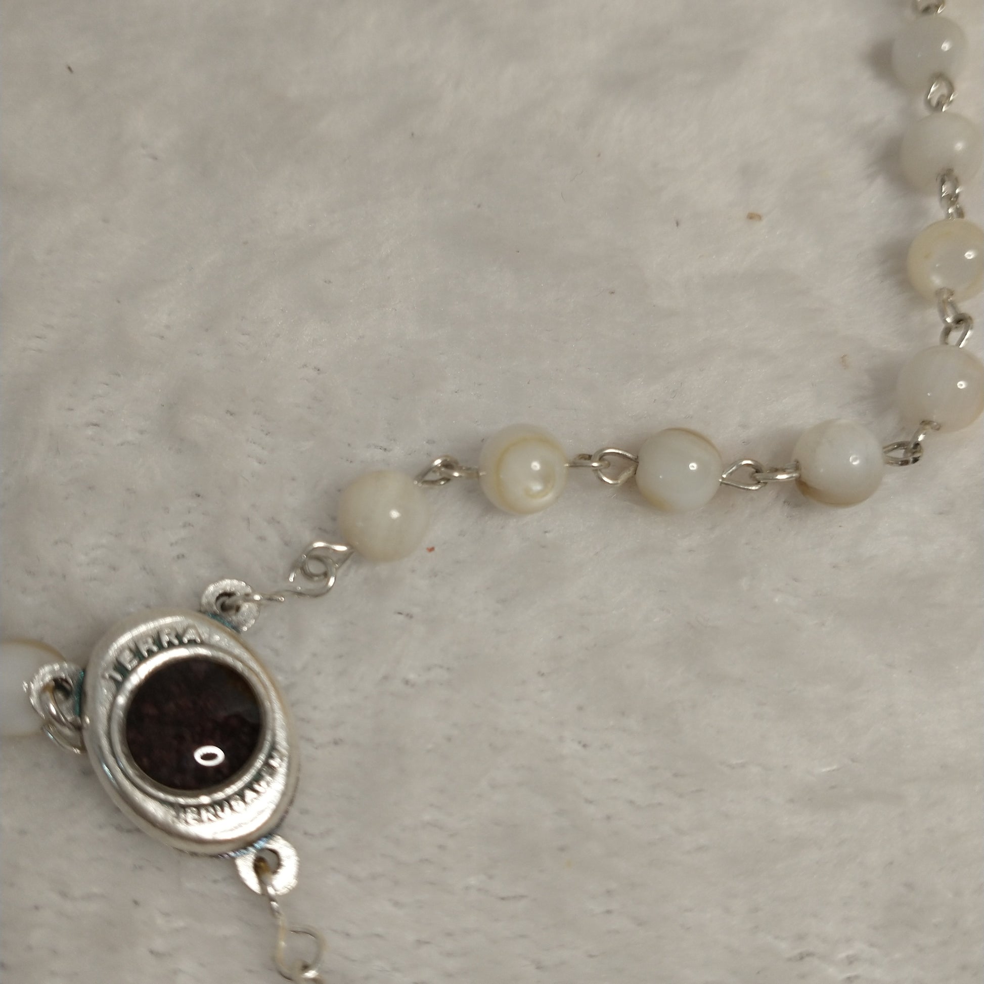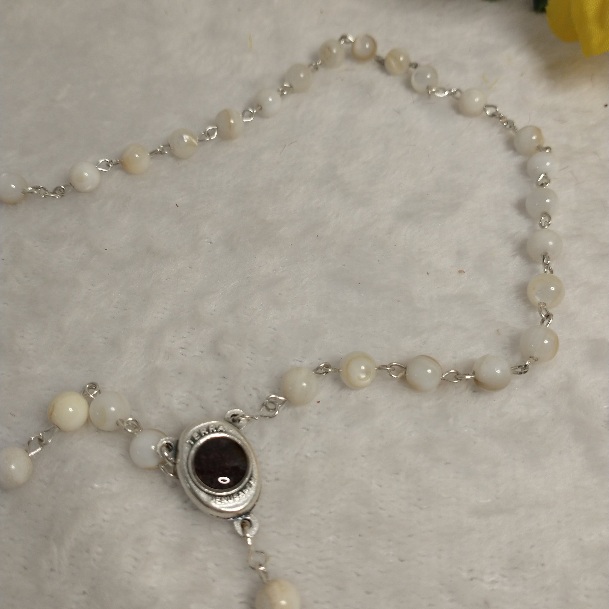 Natural white Mother of Pearl rossary with holy Soil from Jerusalem hand made .